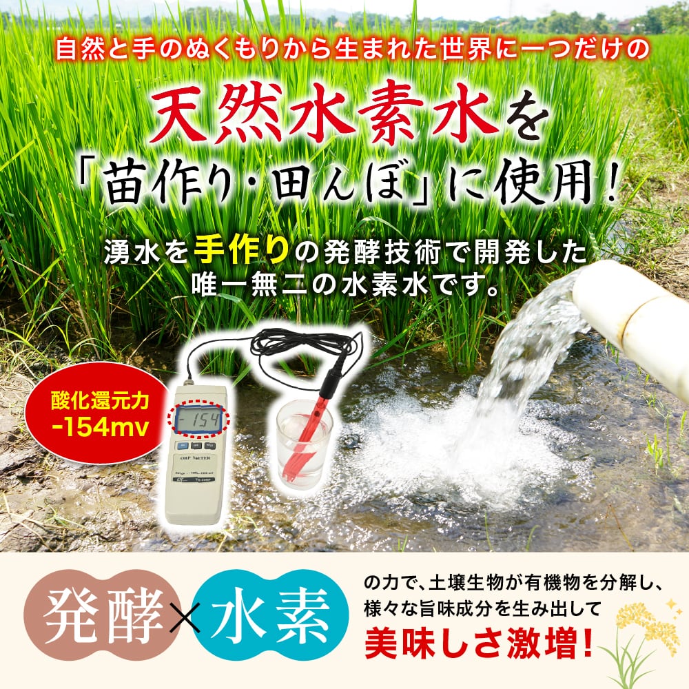 苗づくりから田んぼまで独自の天然水素水を使用。アルカリ性の酸化還元力を持つ特別な水が土壌微生物のエサとなり、発酵土と組み合わせることで微生物がより活発に働き、肥料に頼らずとも稲が育つ理想的な環境が整います。他では真似できない“世界で一つだけの自然農法”です。